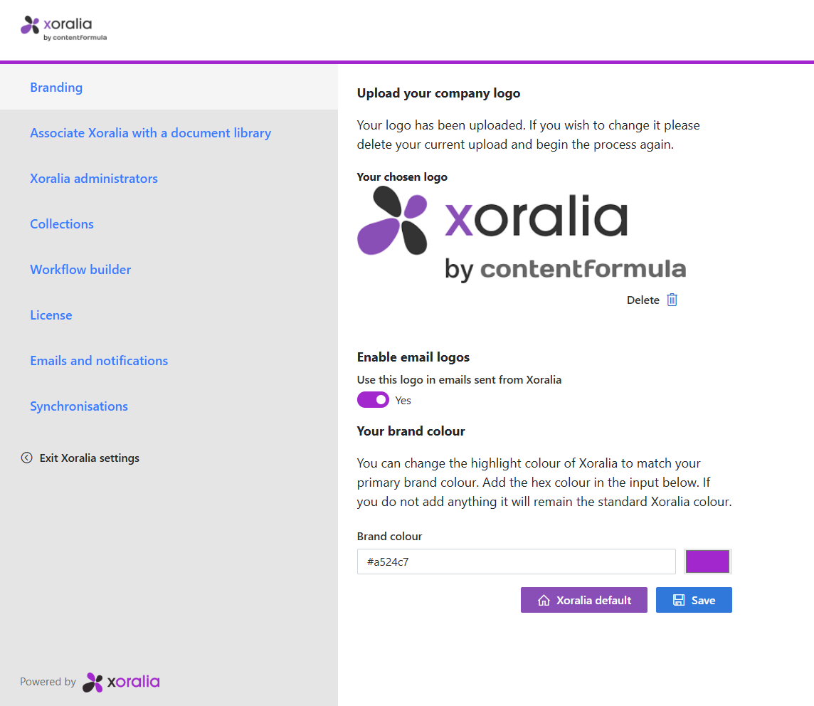 If you have a brand colour you would like to apply to the highlights of Xoralia, in addition to changing the logo for your policy portal, this is now possible in Xoralia settings, under Branding.