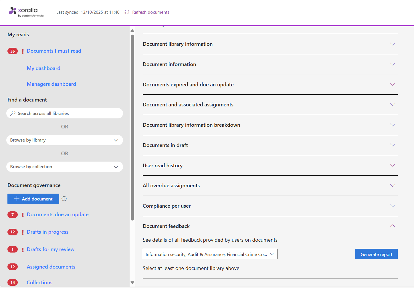 See the feedback readers have provided against documents from the perspective of a Xoralia administrator (as though you are a document owner).